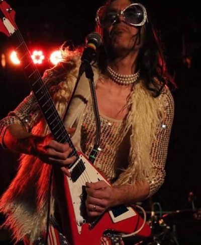Chris DiPinto ; So great to be talking to you Darren! So my aunts and uncles were teen glam fans in the seventies and they would dress me up like Elton John at age five! I loved the song "Crocodile Rock" and in '76 they took me to see him in Philly at the Spectrum. That show is what got me hooked! He opened with "Funeral For A Friend" with smoke machines and double necked guitars....awesome. By fifth grade I'm all Boston, Cheap Trick and Zeppelin and I get my first guitar. But it was guys like Brian May, Randy Rhoads and Eddie Van Halen that set the template for me. Wear cool clothes, write catchy riffs and make your own guitar. My real immersion into seventies glam (not to be confused with mid-late eighties hair glam, that I don't like) happens in the early 2000's when I re-discovered Sweet, Slade and Bolan.